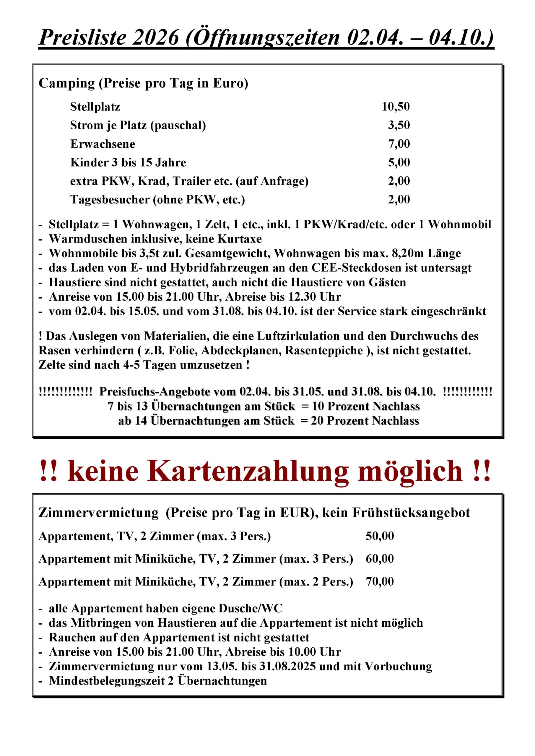 Eine Buchung kann schriftlich, formlos unter Angabe von Namen, Anschrift und Buchungswunsch per Post, Fax oder direkt an unsere E-Mail Adresse erfolgen. Bei Wohnmobilen bitte immer das zulässige Gesamtgewicht angeben. Wohnmobile über 3,5 Tonnen zulässiges Gesamtgewicht und Wohnwagen über eine Länge von 8,20 Meter können nicht aufgenommen werden. Die Buchung ist dann erfolgt, wenn Sie von mir eine Buchungsbestätigung erhalten haben und eine evtl. Anzahlung fristgerecht geleistet ist.